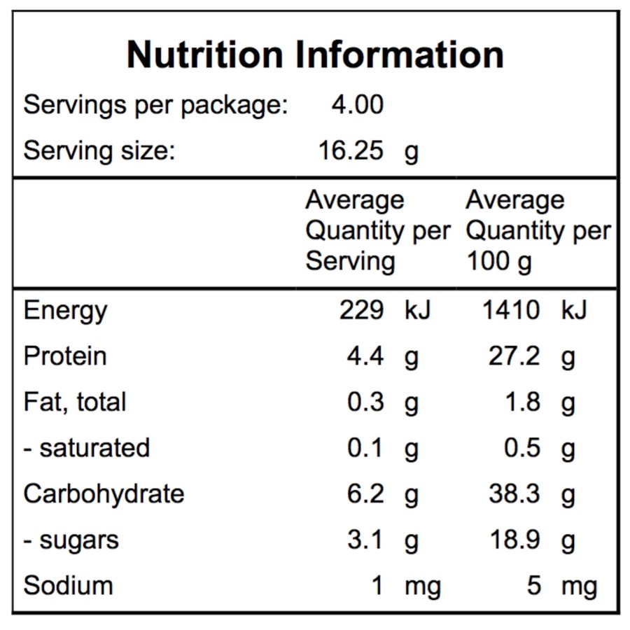 65g Dried = 300g Original Weight = 4 serves x 75 grams