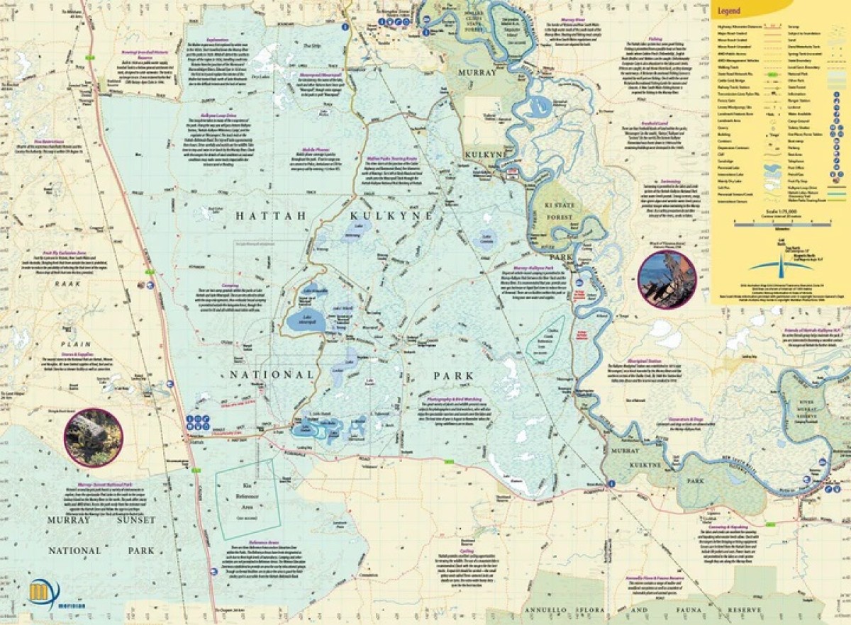 Topographic map (1:75,000 scale) from Meridian Maps covering the Hattah-Kulkyne National Park and the Murray Kulkune Park with enlargements of Lake Hattah and Lake Mournpall camping areas. Features all the tracks, camping areas and lakes of the park. Ideal bushwalking, cycling and four-wheel drive map for this diverse Mallee park. Includes notes on the parks history, ecosystems and activities.