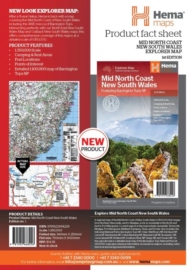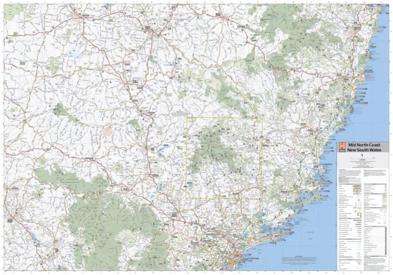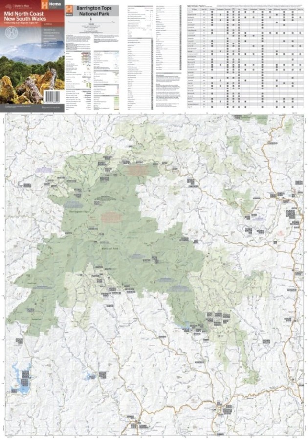 A regional map of the Mid North Coast of New South Wales (1:350,000) that ranges from Northern Newcastle, west to Mudgee, as far as Gunnedah in the North and East to Port Macquarie. Covered regions in the map include; Gunnedah, Tamworth, Mudgee, Port Macquarie, Maitland, Kempsey, Taree, and Forster. Also includes the following National Parks; Barrington Tops NP, Oxley Wild Rivers NP, Hat Head NP, Carrai NP, Werrikimbe NP, Cottan-Bimbang NP, Mummel Gulf NP, Nowendoc NP, Curracabundi NP, Wollemi NP, Goulburn River NP, Yengo NP, and Towarri NP. On the opposite side is a detailed inset map of the Barrington Tops National Park (at 1:100,000 scale) plus extensive information on numerous regions, including visitor, historical and background information.