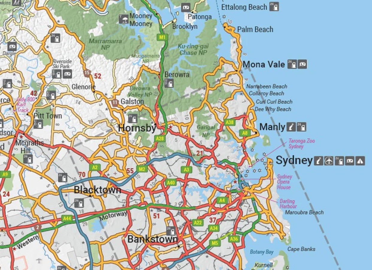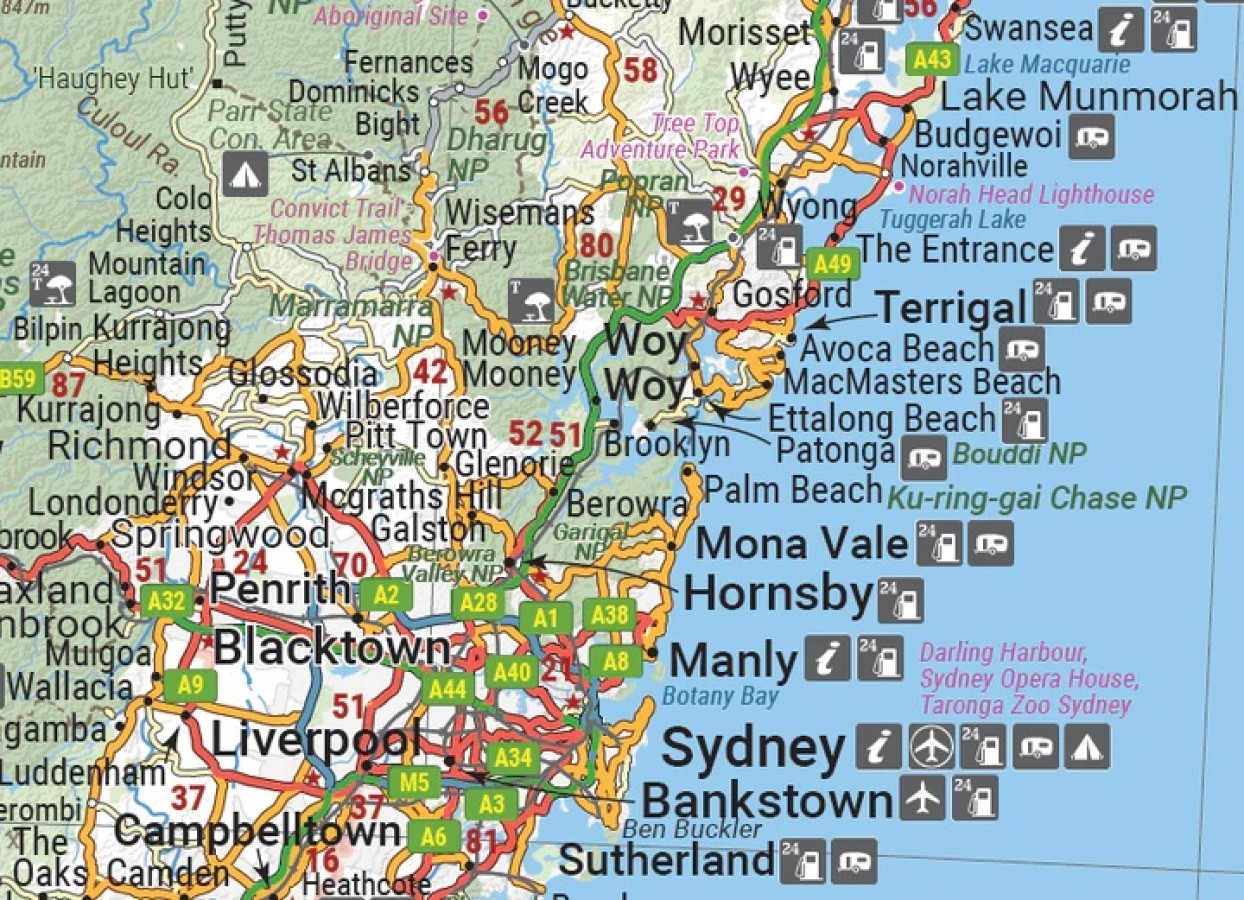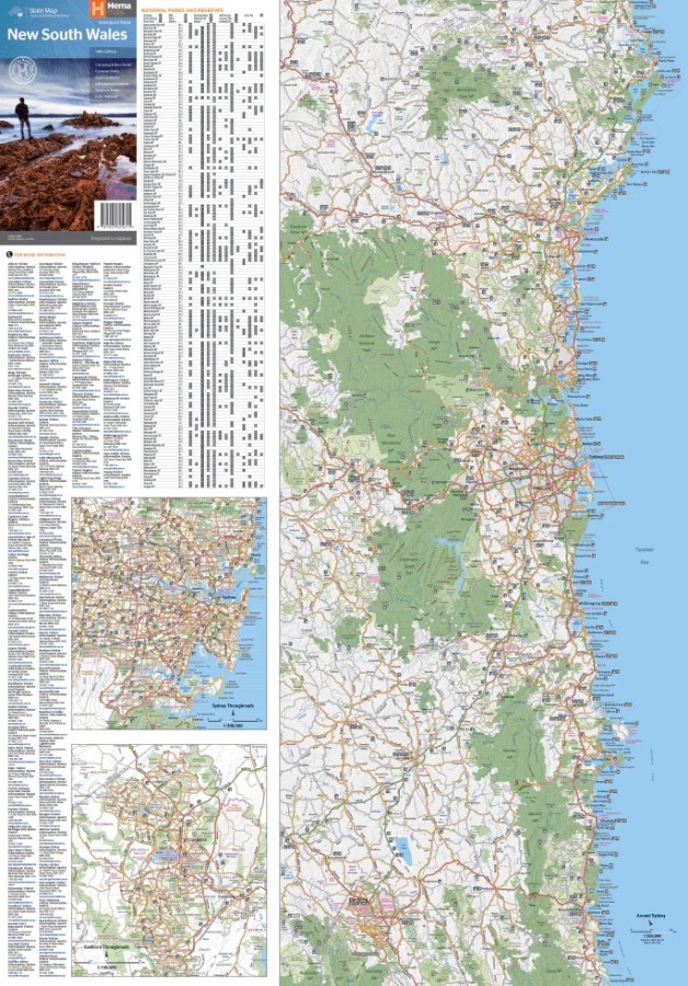 This state map of New South Wales is at a scale of 1:1,500,000 and includes national parks, points of interest, 24-hour fuel in addition to camping and rest areas. On the reverse side are through road maps of Sydney and Canberra, as well as the Sydney regional area. There is a full index included, as well as all national park information.