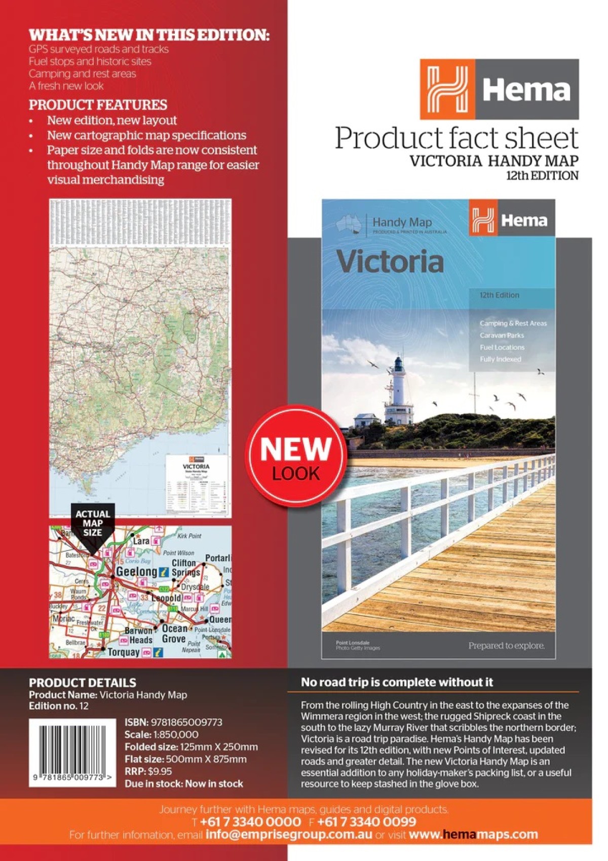From the rolling High Country in the east to the expanses of the Wimmera region in the west; the rugged Shipwreck Coast in the south to the lazy Murray River that scribbles the northern border; Victoria is a road trip paradise. Hema’s Handy Map has been revised for its 12th edition, with, updated roads, greater detail, distance grid and index for planning and reference. Also marked on the mapping are highways, major and minor roads, points of interest, information centres, picnic areas, caravan parks and lookouts. The Victoria Handy Map is an essential addition to any holiday-maker’s packing list, or a useful resource to keep stashed in the glove box.