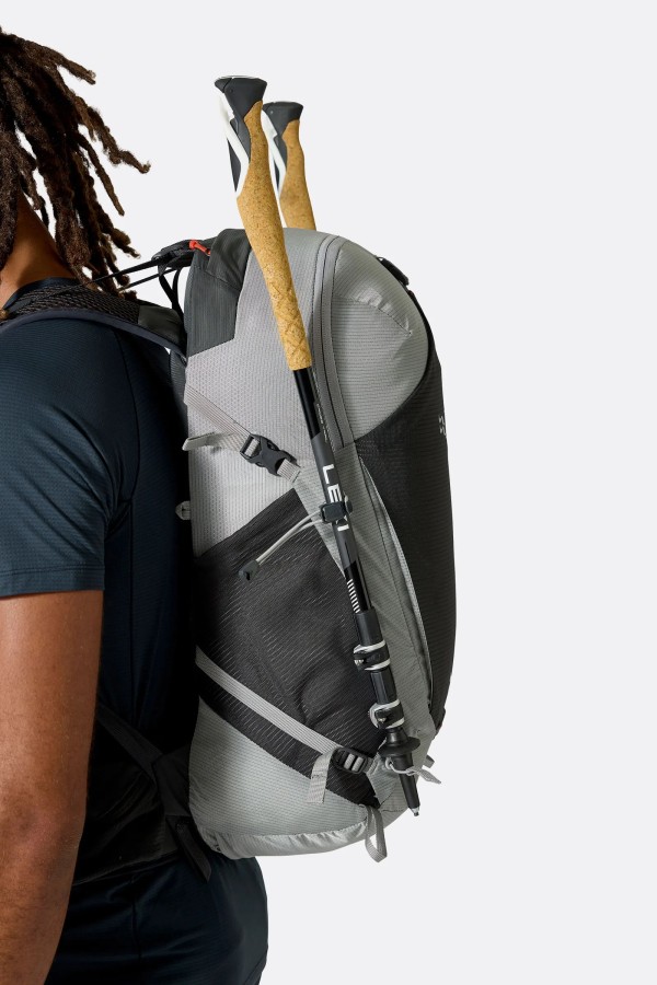 Stow walking poles with the attachment loops and bungee retention system.