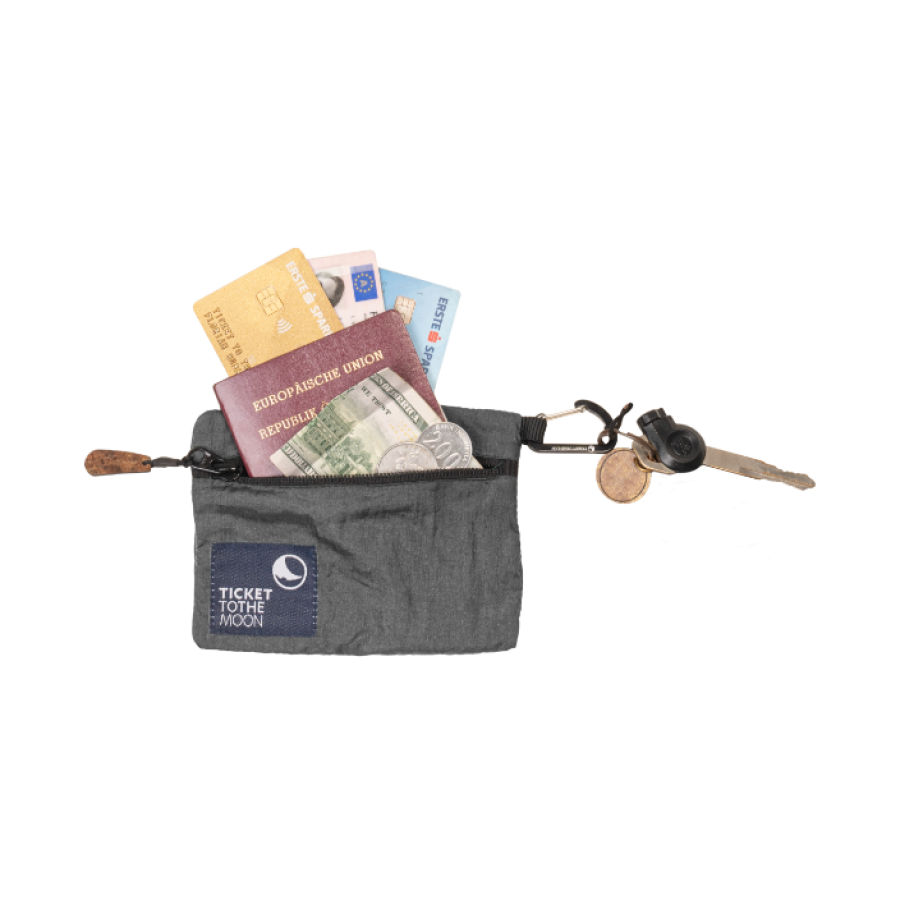 The travel wallet is a minimalistic gadget for safekeeping of your valuables that comes with a mini carabiner so that everythings stays in place.